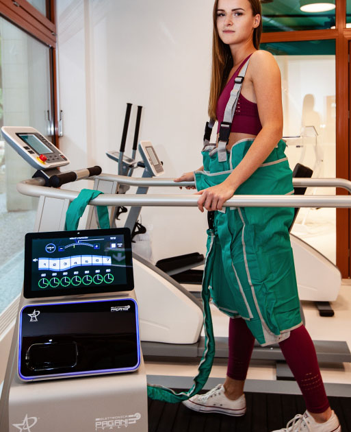 Bu patentli sistem sayesinde masaj doğal ortostatik pozisyonda gerçekleşir ve kullanıcının koşu bandında yürümesine olanak tanır. Bu dikey, hareket halindeki özgürlük şunları sağlar:
